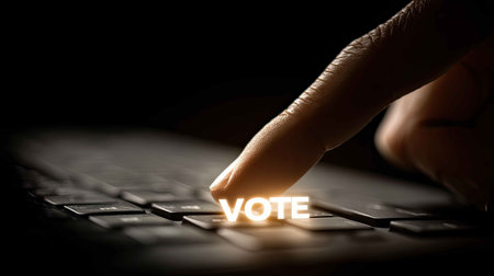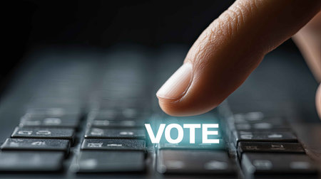 A close-up image showing a finger pressing the vote button on a computer keyboard. This representation captures the essence of digital engagement in elections, emphasizing participation.