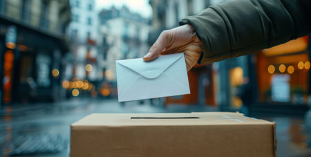 Close up of a person's hand inserting a blank envelope into a ballot box. Space for text.