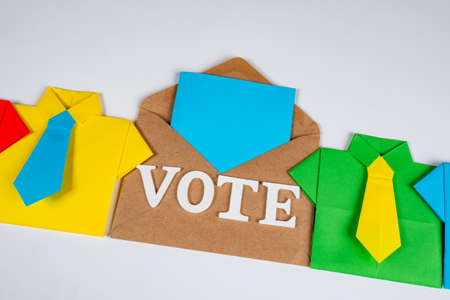 A vivid conception of voting. An envelope with the word vote next to the origami men. Fragments of the voting concept are spread out with a tilt on a white table. Selecting the desired option.