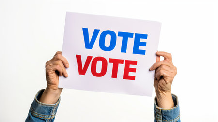 Hands holding a VOTE sign. A call to civic duty and participation. Concept of democracy, elections, voting rights, and political engagement. Isolated on white background