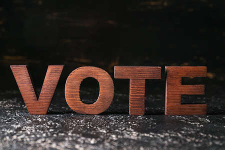 American flag as backdrop for the word VOTE, voting process. Presidential election campaign