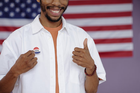 Hand of young African American male citizen of USA showing small round vote badge while standing in front of camera