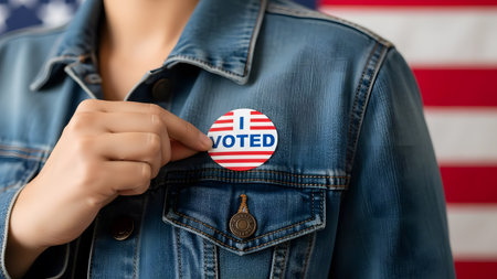Close up of person pinning I voted sticker on denim jacket with blurred American flag background.