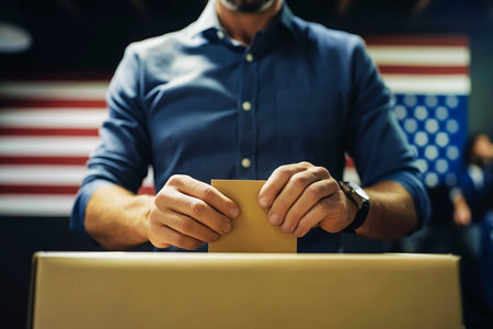 Man voting in an election. Voter casting ballot with US flags behind. Male hand placing ballot into voting box at a polling place. Concept of democracy, presidential elections, freedom