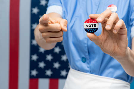 Close up of young woman handing out ballots and Voter stickers on election day, copy space