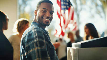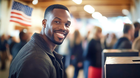 A cheerful man participates in the democratic process, casting his vote at an American polling station, surrounded by citizens fellows and vibrant flags.