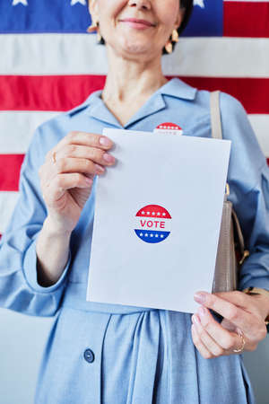 Closeup of smiling woman taking voting ballot on election day with American flag, copy space