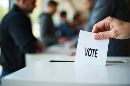 Hand of a person casting a ballot at a polling station during voting.