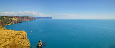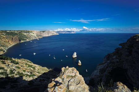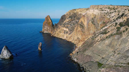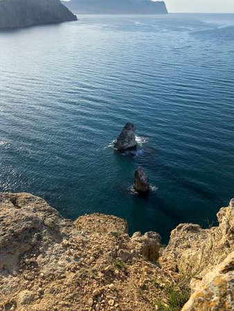 Beautiful view from the cliff on the blue sea. Incredible coast with freestanding cliffs in the sea. Cape Fiolent, Crimea.