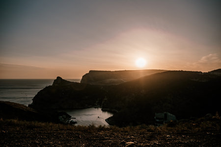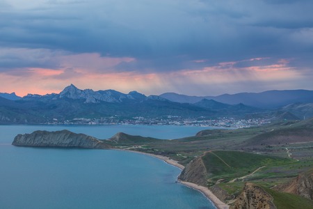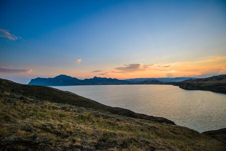 Sunset landscape overlooking the hilly coastal line in Crimea, Koktebel.