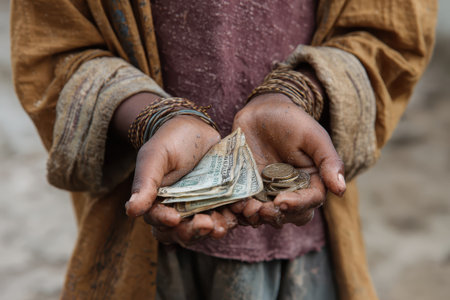 Soft focus highlights the delicate hands of a poor child gripping tightly, revealing the struggles and innocence amidst challenging circumstances in a dimly lit environment