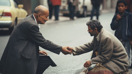 Generative AI : Generous businessman gives money to a homeless