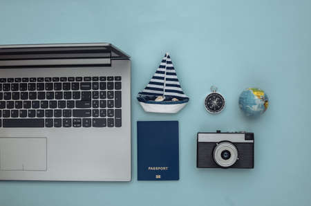 Flat lay travel. Passport, retro camera on blue wooden background with laptop. Top view vacation concept