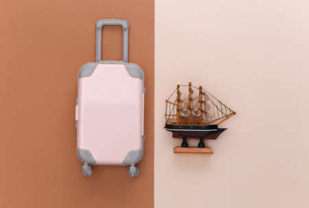 Travel minimalism. Mini plastic travel suitcase and ship on beige brown background. minimal style. Top view, flat lay