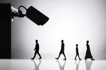 Silhouette Of CCTV Camera Over People Walking On Reflective Background