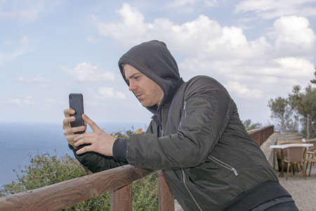Young handsome man in black hood jacket photographs the sea takes a picture with smartphone in Mallorca, Spain