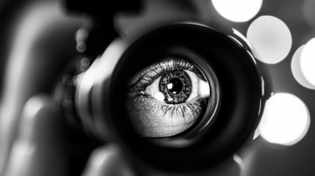 This captivating close-up features an intense gaze of a photographer peering through a camera lens, showcasing the intersection of technology and artistry in photography.