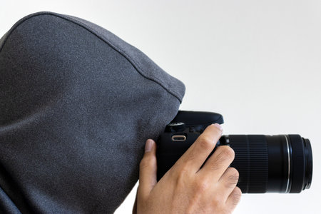 The photographer hidden with the camera. A man in a hood is taking pictures hidden.