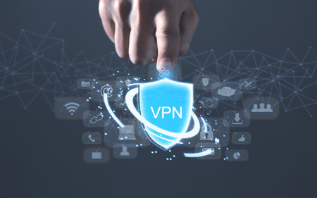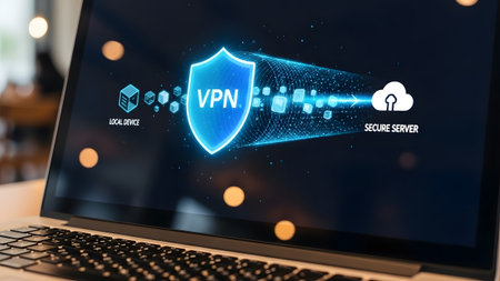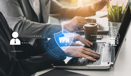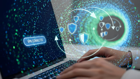 Person uses laptop showing VPN connected status and digital shields for security Clear details an...