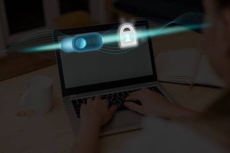 Person using a laptop computer with technology cybersecurity and privacy concept. protection and safe data for global network security.