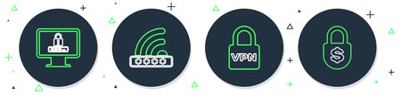 Set line Wifi locked Lock VPN Monitor with password and Money icon. Vector.