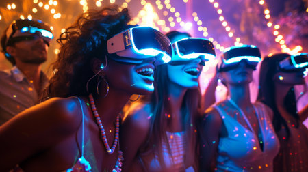 Guests at a lively party engage in an immersive virtual reality experience, wearing VR glasses while surrounded by colorful lights and vibrant decorations, creating a festive atmosphere.