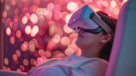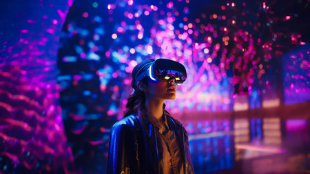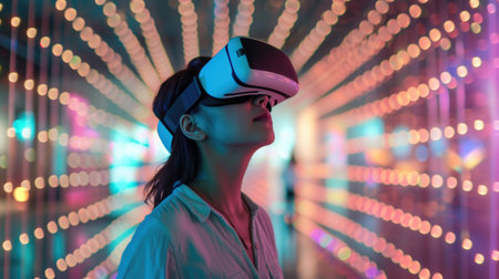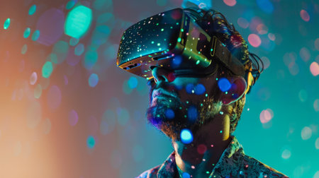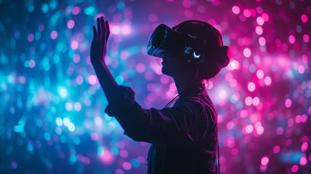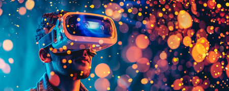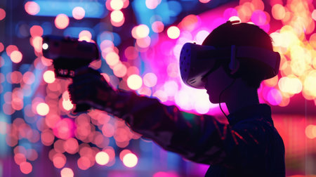An individual is completely absorbed in a vibrant virtual reality world, with glowing bokeh lights enhancing the immersive digital environment.