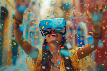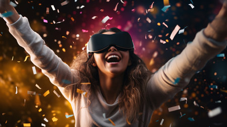 An exuberant woman joyously celebrating by donning VR glasses in the digital realm.