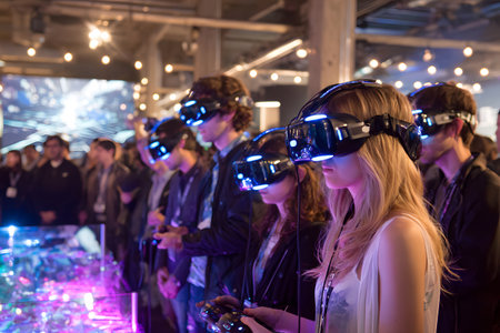 A group of individuals enthusiastically engages in a virtual reality activity, immersed in a shared digital experience and expressing joy through laughter at a tech gathering.