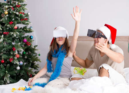Young man and woman at home playing games by having fun wearing vr with joy stick.