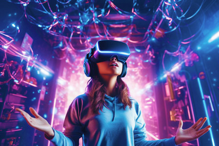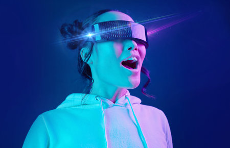 Portrait of a beautiful young woman wearing virtual reality goggles in futuristic style and neon lighting.