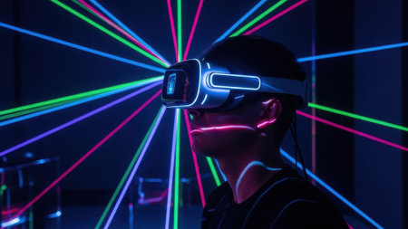A person's profile is illuminated by a neon VR headset and a vibrant laser light display creating an immersive digital environment