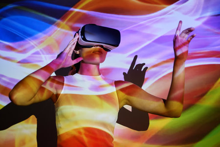 trendy 40 years old woman in virtual reality in vr headset exploring.