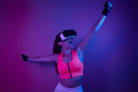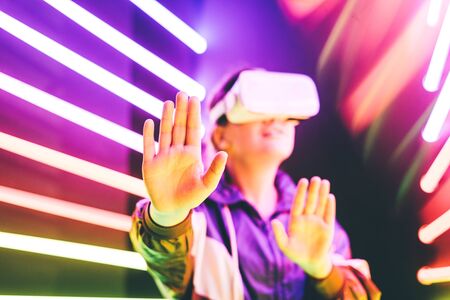 Girl using VR goggles in colorful neon lights studio. The girl put her hands forward and looks around. Digital innovation technology concept. Virtual augmented reality.