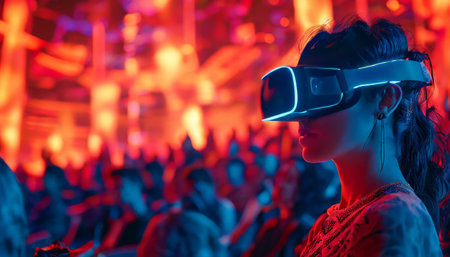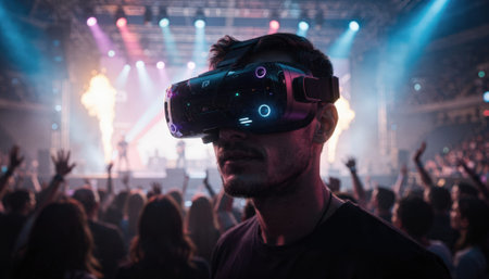 Virtual Concert Experience: Fans wearing VR headsets, attending a virtual concert, capturing the energy and excitement of live performances in a virtual space.