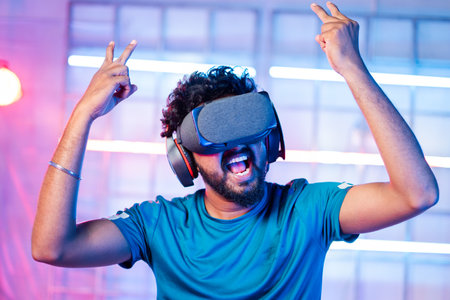 Happy cheerful Young man with VR or virtual reality goggles or headphones dancing on neon light staged backgound - concept of modern technological experience