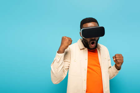 Excited man gesturing and using virtual reality headset during 2019 new year
