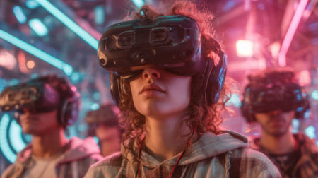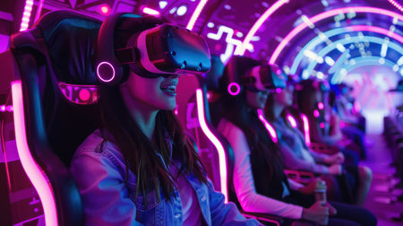A young woman sits in a brightly lit arcade, wearing a VR headset, with a group of other people behind her, all wearing VR headsets and enjoying an immersive gaming experience. The arcade is decorated with neon lights and a futuristic design, creating a vibrant and exciting atmosphere.