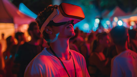 Male With Vr Glasses, Man wearing virtual reality headset surrounding at Concert Festival.