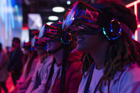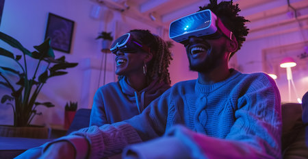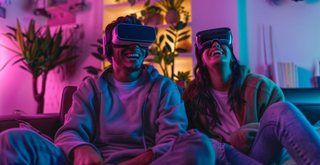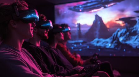 Group of friends enjoying virtual reality gaming in a dimly lit room with stunning visuals