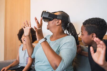 Portrait of African American grandmother and grandchildren playing together with VR glasses at home. Family and technology concept.