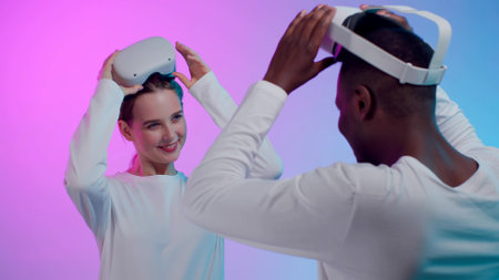 Multiethnic couple in write clothes remove augmented reality goggles and smile isolated