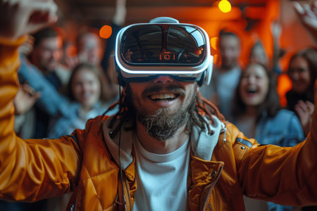 Man with VR glasses is immersed in virtual experience, gesturing excitedly as her friends have fun in living room. Home party in modern apartment