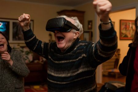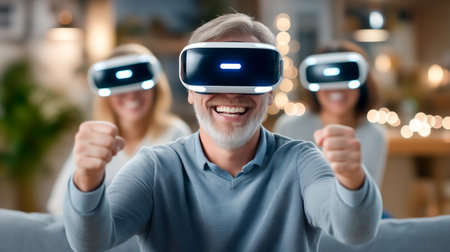 Senior man wearing a virtual reality headset, raising his fists in excitement while surrounded by laughing family members
