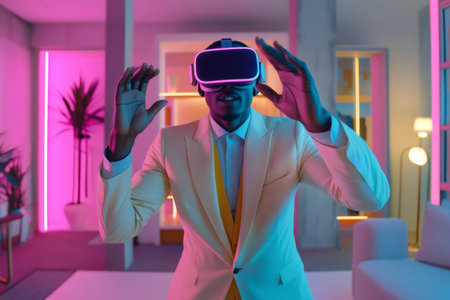 African American man in a suit wearing a VR headset, gesturing in a modern, neon lit room, showcasing virtual reality technology