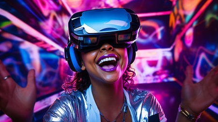 A woman wearing VR headset excited and enjoying futuristic virtual reality cyberspace, innovation technology and gaming concept. Generative AI