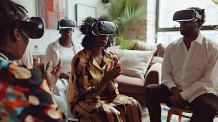 A diverse group exploring virtual reality in a relaxed living room setting. Modern innovative technologies in everyday life, psychological reboot, joint learning, discussion