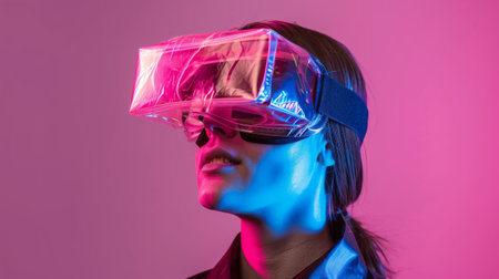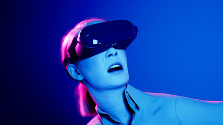 Woman Experiencing Virtual Reality with Futuristic VR Headset in Neon Lighting