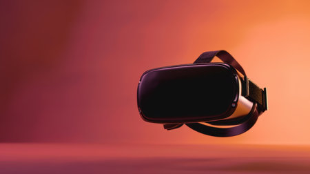 Virtual reality headset with sleek design, suspended against vibrant orange background, showcasing modern technology and immersive experiences