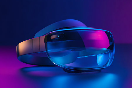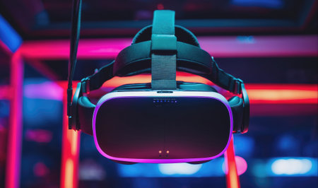 High tech VR headset with a transparent visor reflecting neon blue and pink light, representing immersive digital experiences and the metaverse